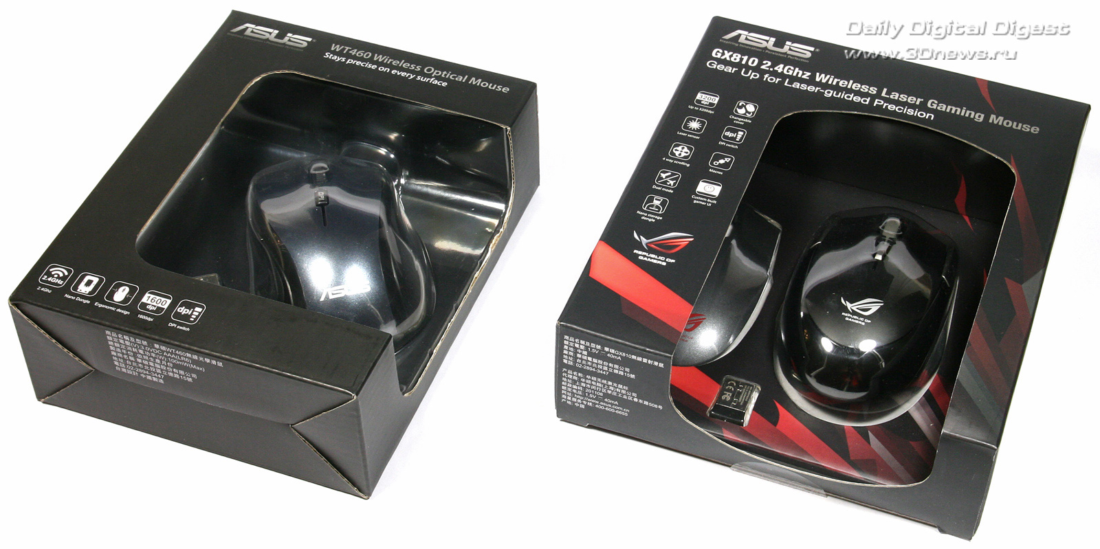 К нам в тестовую лабораторию попали как раз такие небольшие, но функциональные мышки производства компании ASUS. Модель ASUS WT460 предназначена для тех пользователей, которым нужен максимальный комфорт при длительной ежедневной работе, а вторая мышь, ASUS GX810, может привлечь любителей игр, ведь выпускается она в серии Republic of Gamers (ROG), в которой представлено немало игровых ноутбуков, графических карт и других устройств, целевой аудиторией которых являются геймеры.
