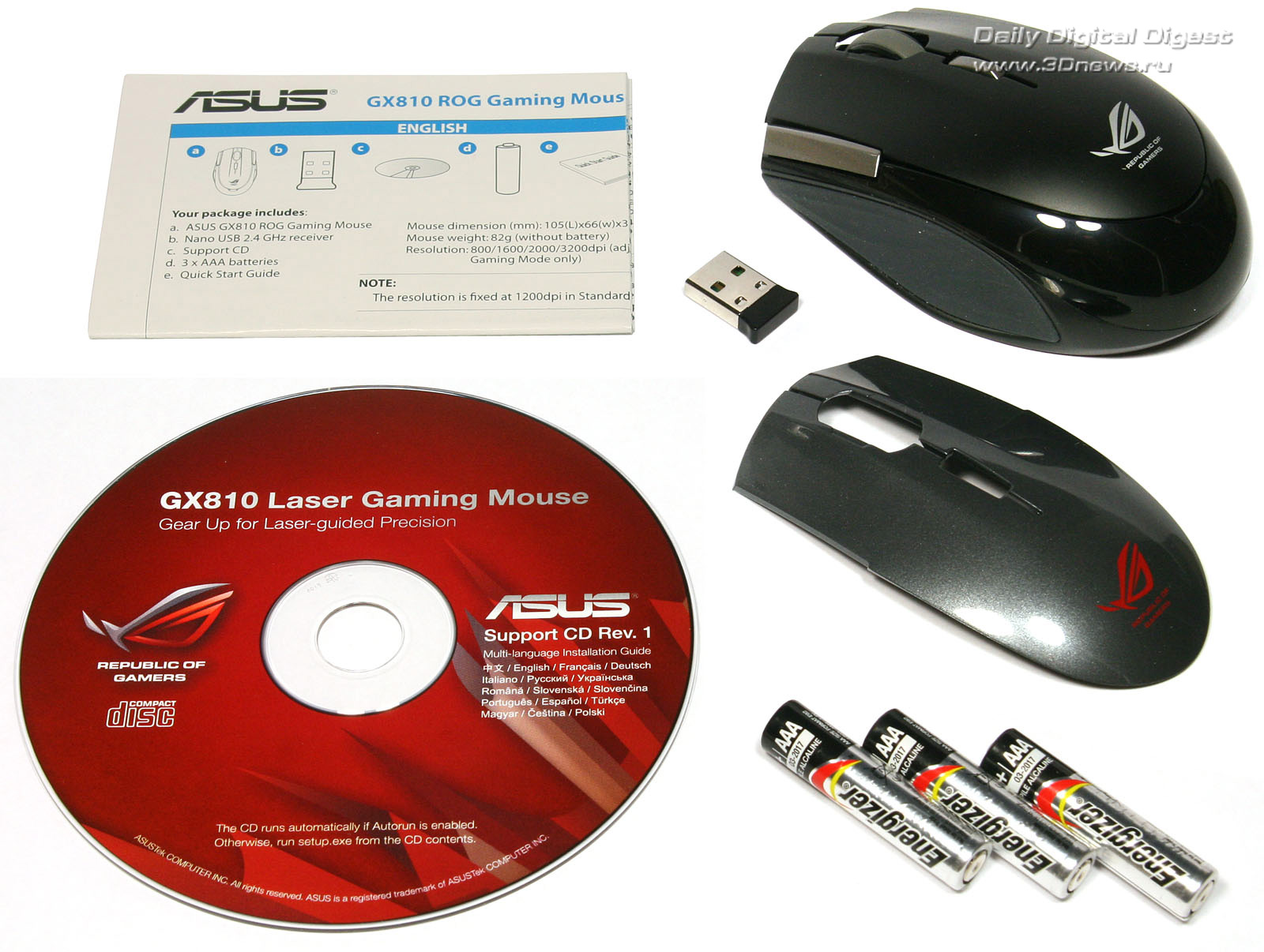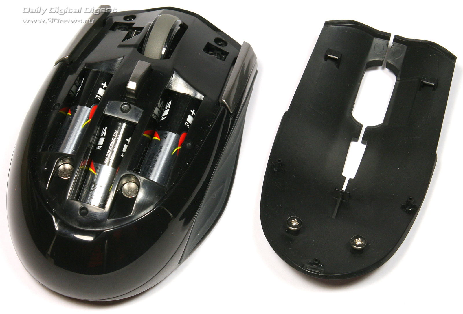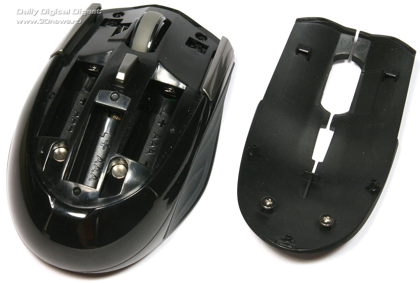 Но система питания у ASUS GX810 оказалась даже более оригинальной, чем это заявлено в технических характеристиках. Можно не только переключать режимы работы, но ещё и выбрать, сколько именно батареек или аккумуляторов установить в корпус мышки — ставить сразу все три совсем необязательно. В зависимости от того, какую массу в итоге вы хотите получить, можно загрузить манипулятор одной, двумя или тремя батареями типа ААА. Игроки должны оценить эту возможность по достоинству, хотя, конечно, странно, что такая оригинальная особенность никак не отмечена в технических характеристиках изделия. Ну а сам батарейный отсек расположен под сменной панелью, которая крепится к корпусу мышки с помощью двух относительно мощных магнитов.Аккумуляторный отсек манипулятора ASUS GX810