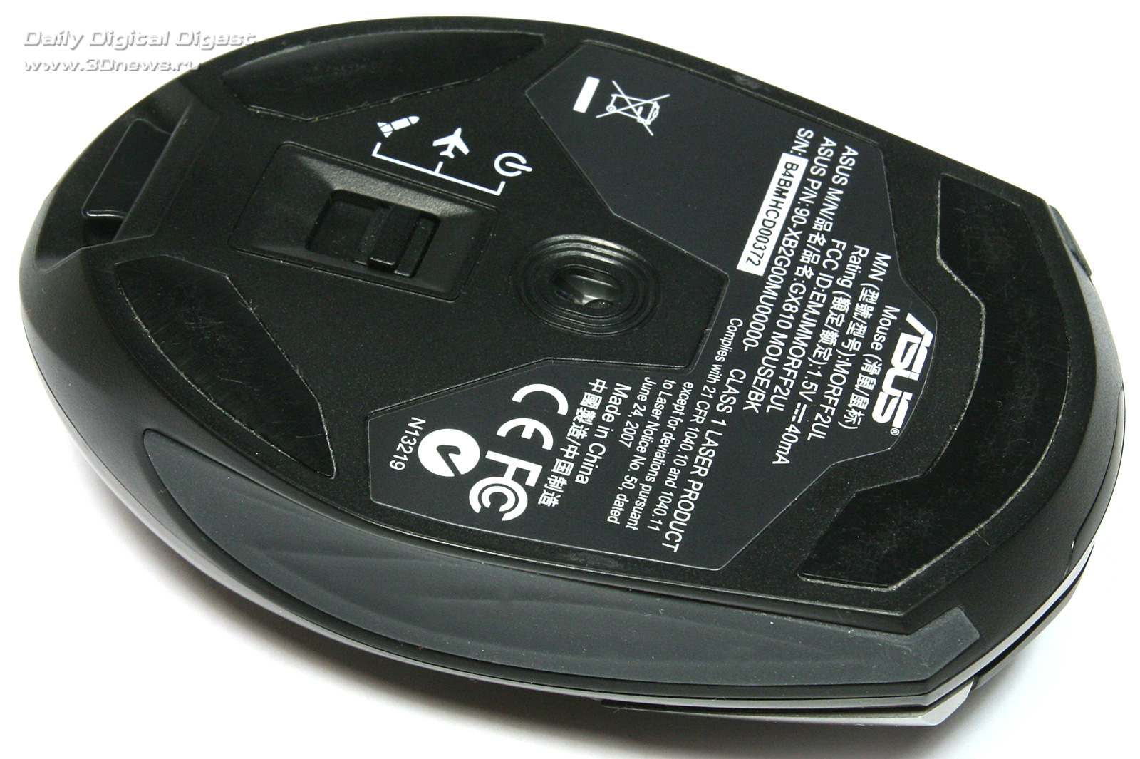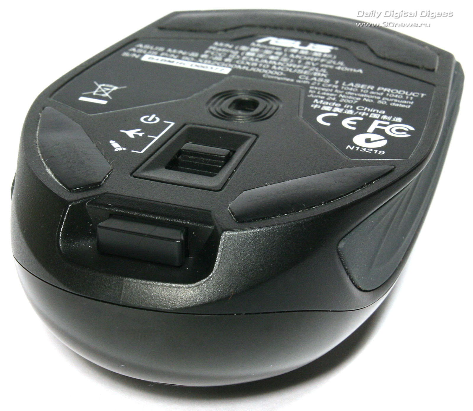 Скользит новинка благодаря трём очень большим по площади фторопластовым накладкам. Кроме них и оптического сенсора, на нижней поверхности корпуса расположена сдвижная клавиша, имеющая не два, а три рабочих положения: питание выключено, экономичный режим и высокопроизводительный режим. Два режима работы позволяют максимально экономно расходовать энергию расположенных на борту батарей или аккумуляторов. Режимом с пониженным энергопотреблением можно пользоваться во время обычной офисной работы, а на полную мощность выводить манипулятор в играх.Нижняя поверхность корпуса манипулятора ASUS GX810