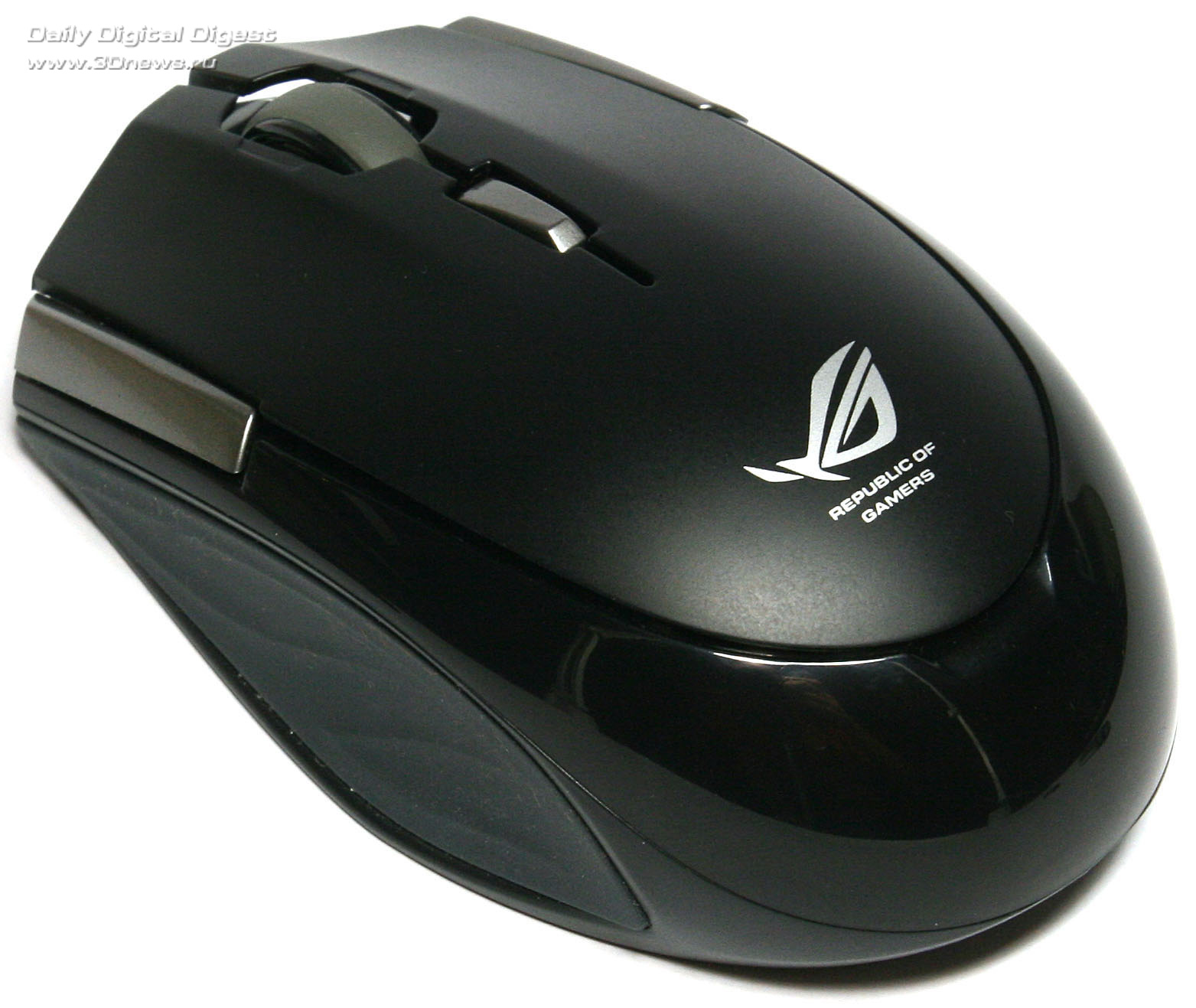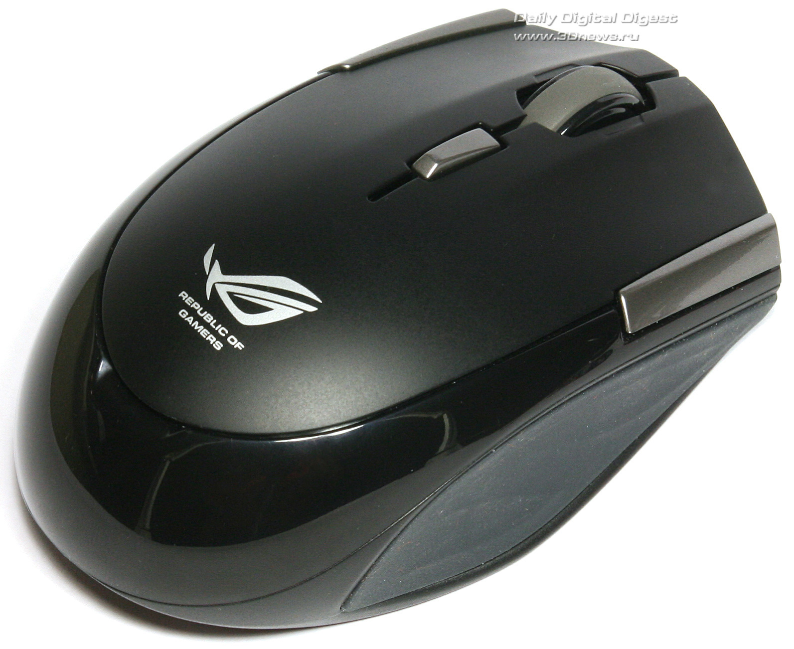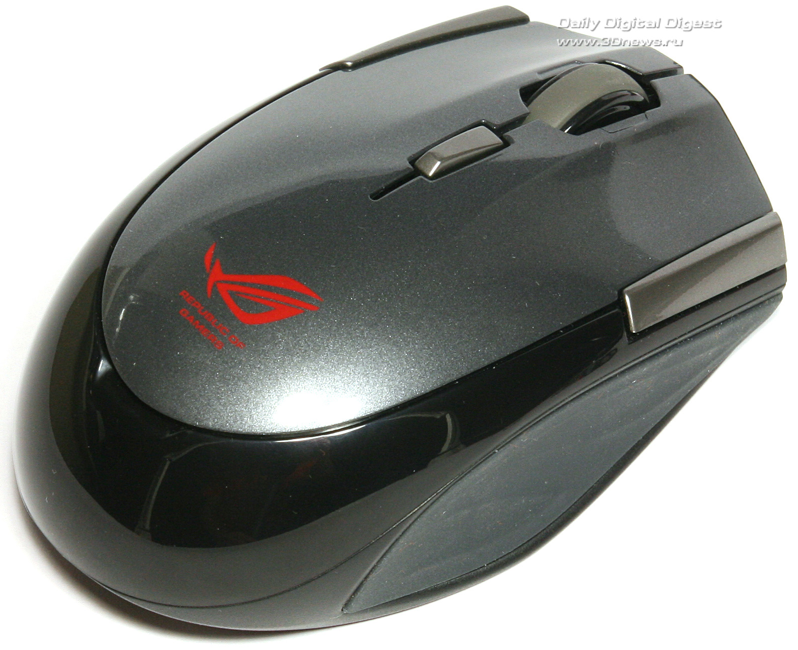 Внешний вид и эргономичностьВ отличие от модели ASUS WT460, игровой манипулятор имеет симметричную форму корпуса, а потому прекрасно подойдёт как правшам, так и тем игрокам, которые привыкли нажимать на курок левой рукой. Плавные изгибы корпуса и боковые резиновые накладки позволяют достаточно прочно ухватиться за корпус новинки, но таких восторженных впечатлений, какие возникали от эргономичности предыдущей модели, ASUS GX810 не производит.