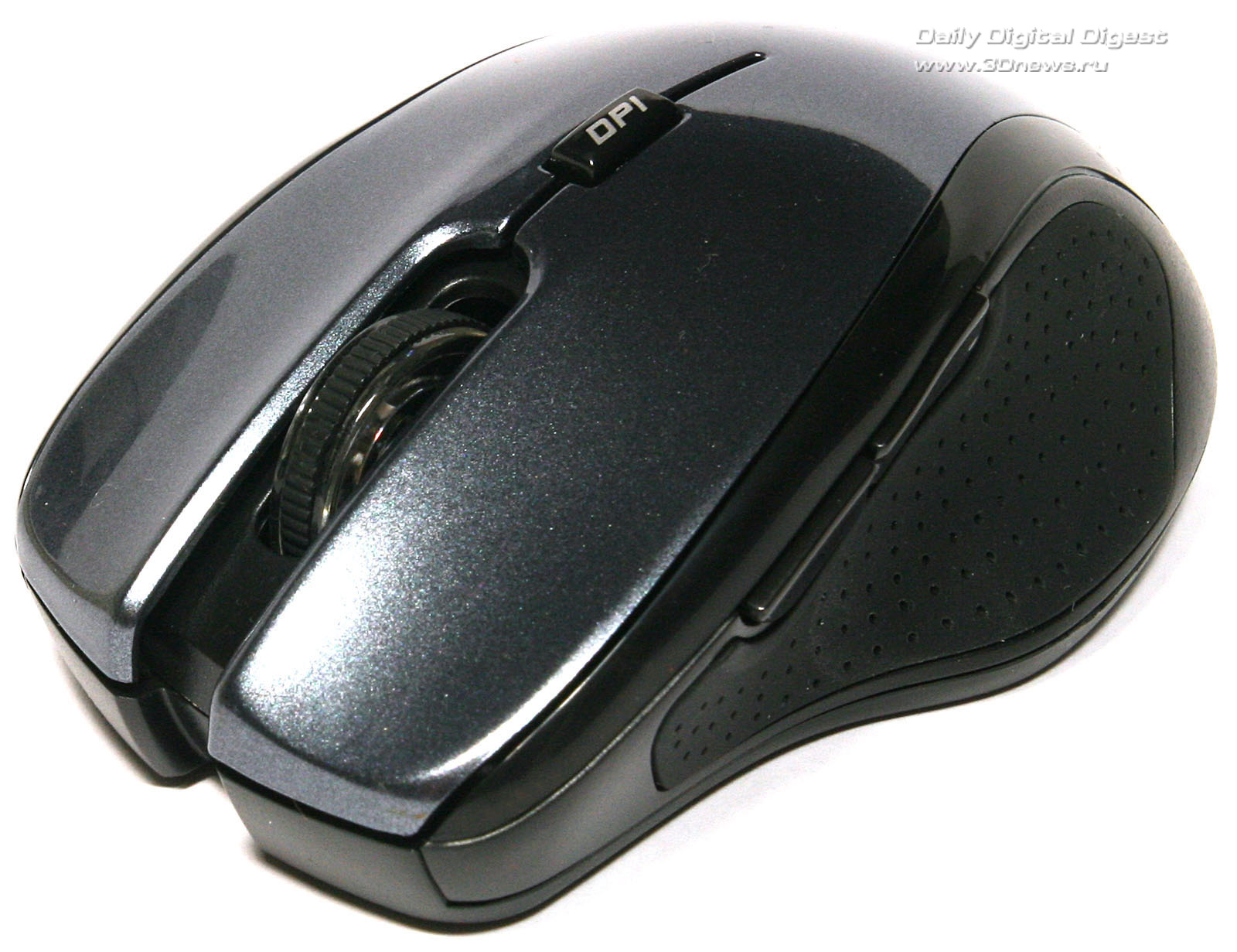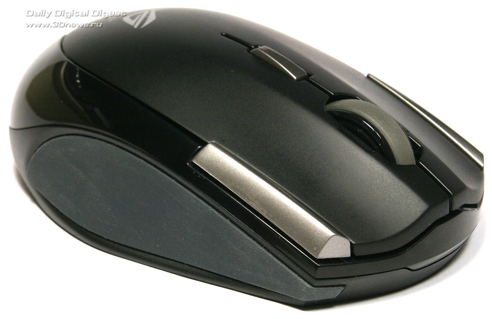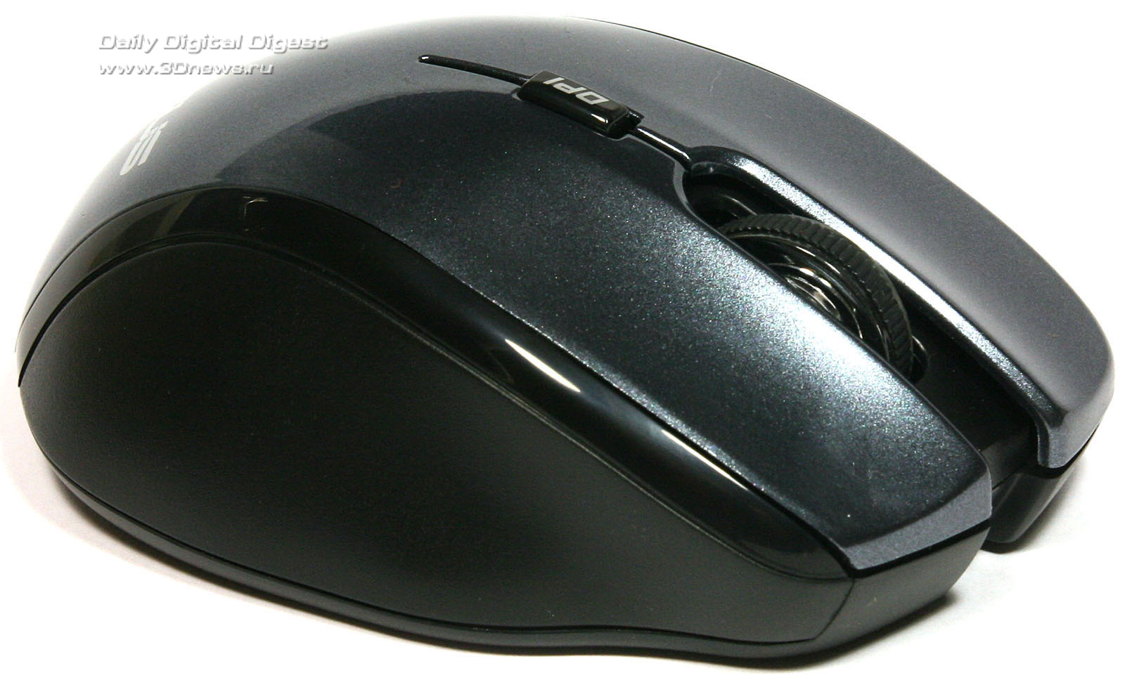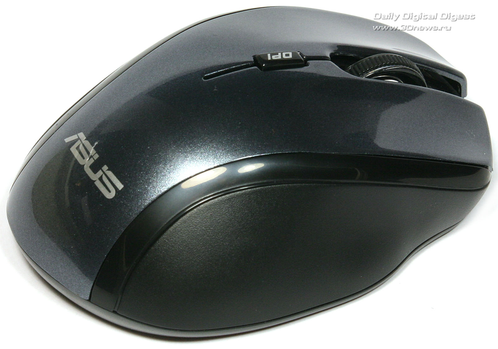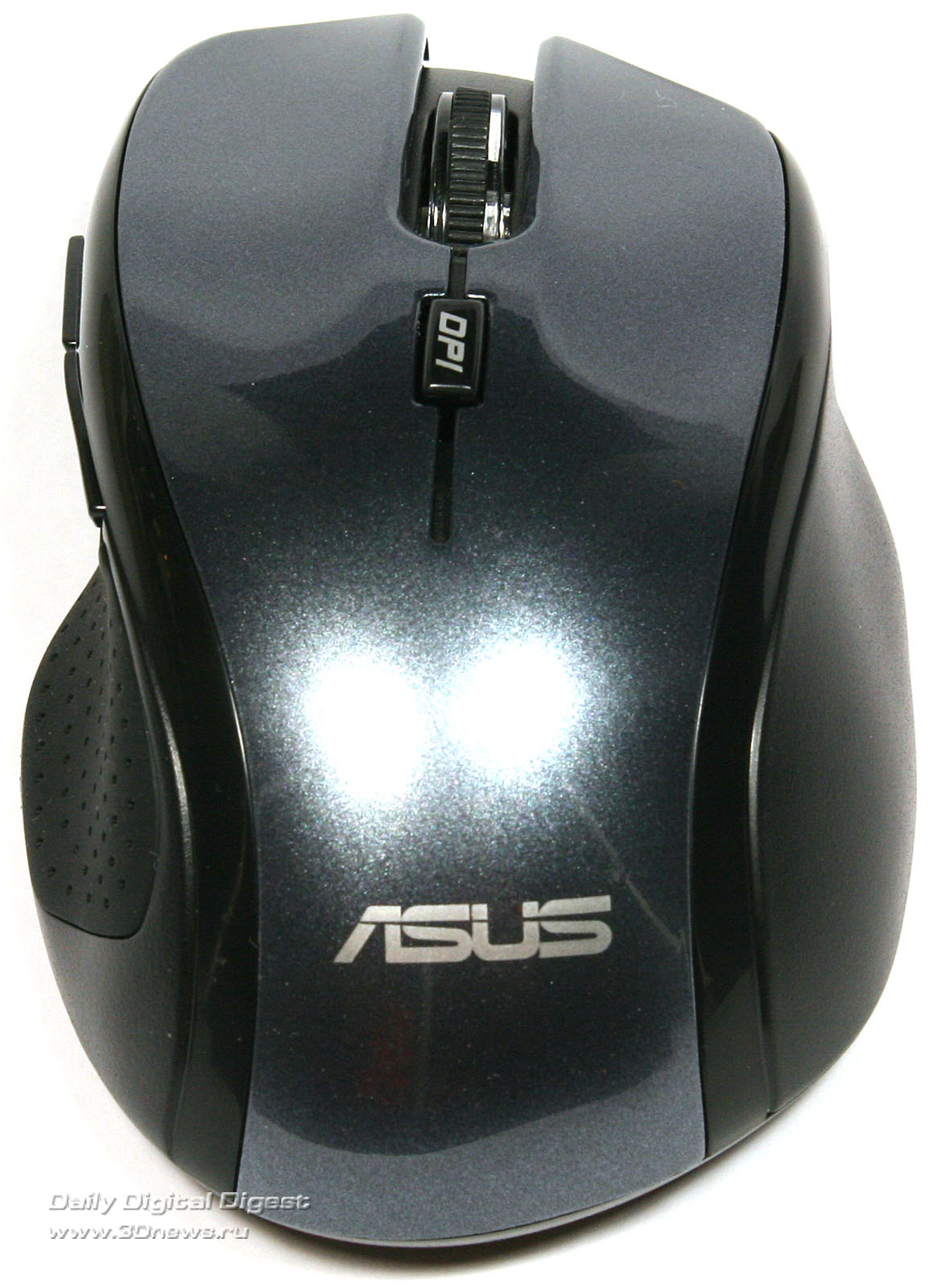 Верхняя лакированная панель и поверхность основных клавиш представляют собой единую деталь, разделенную пропилом для размещения колеса прокрутки, которое у модели ASUS WT460 позволяет перемещаться по странице не только по вертикали, но и по горизонтали. Поверхность колеса ребристая, из резины, что исключает соскальзывание пальца при работе. Чуть выше колеса прокрутки находится самая маленькая кнопка с надписью DPI. Нетрудно догадаться, что нажатие на эту кнопку ведёт к последовательному переключению разрешения оптического сенсора между режимами 800, 1200 и 1600 DPI.Верхняя панель корпуса манипулятора ASUS WT460