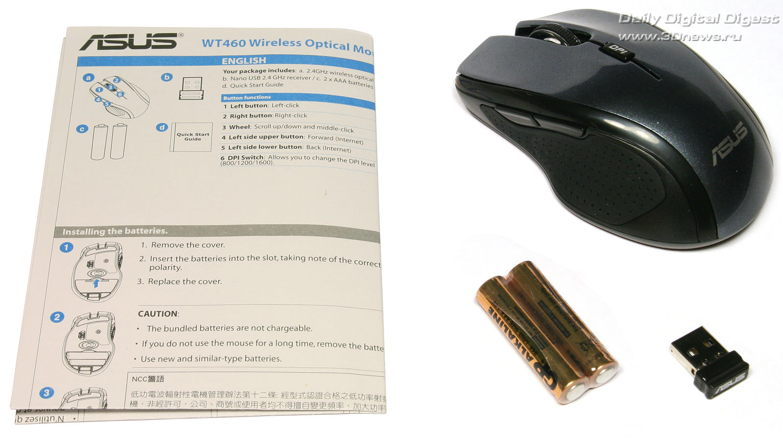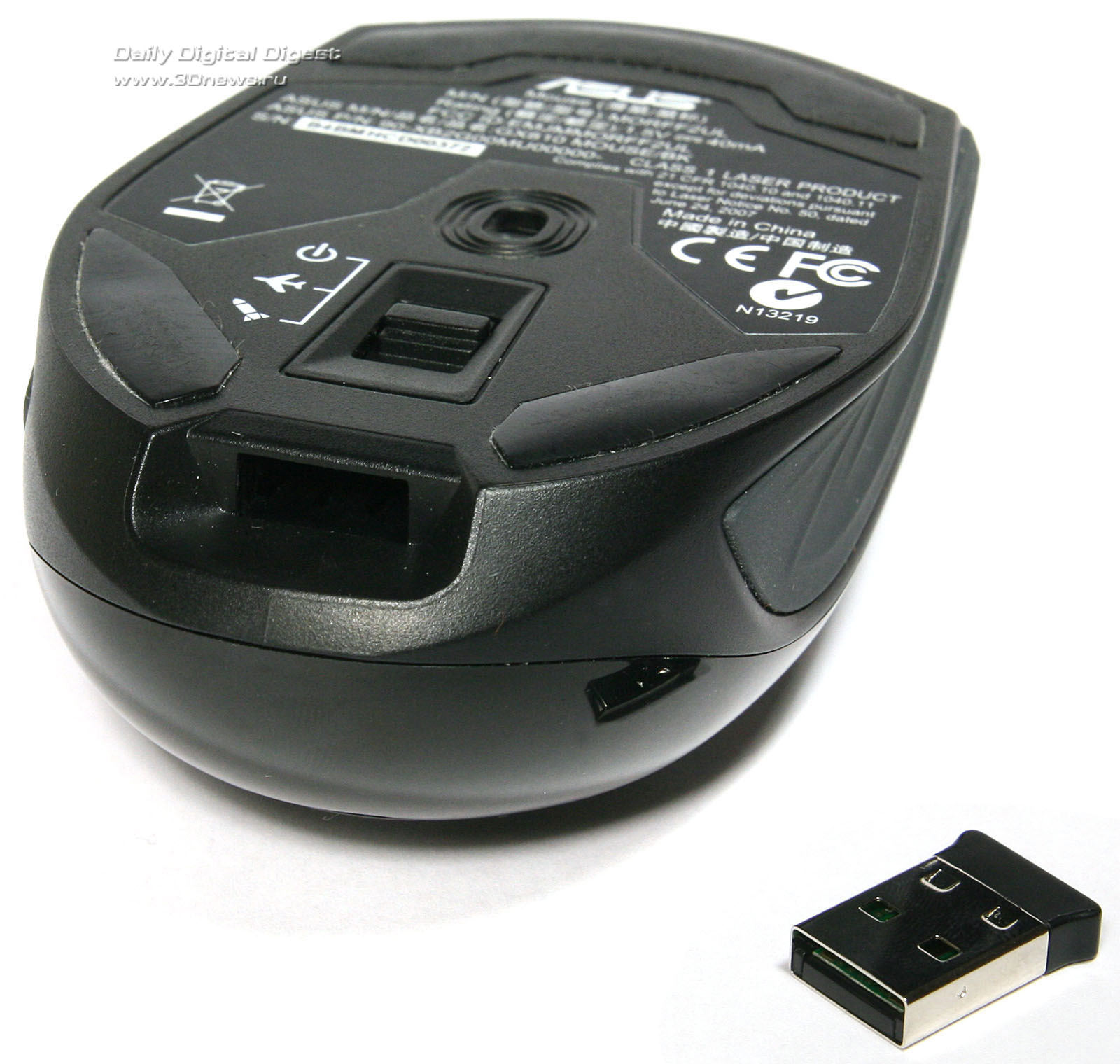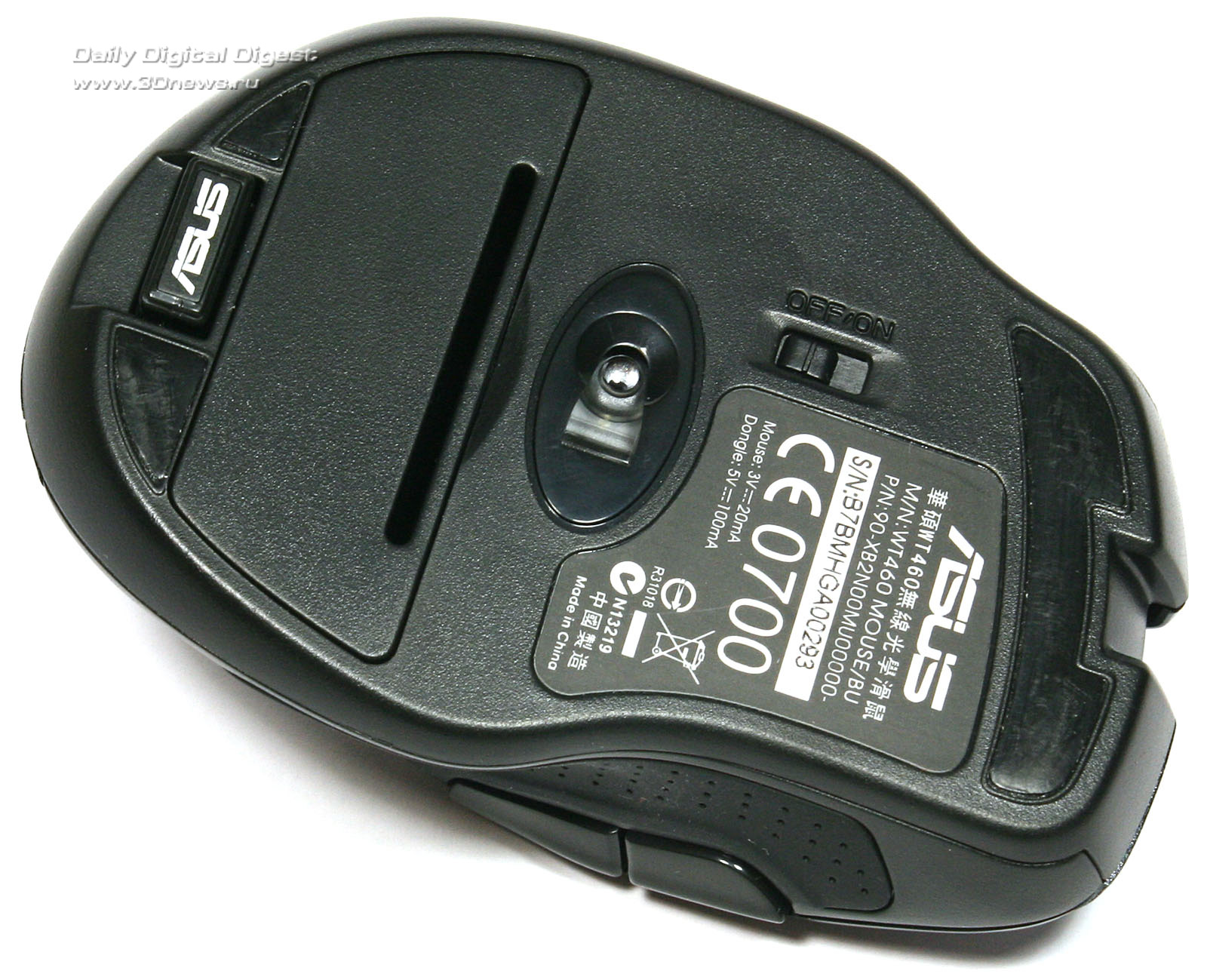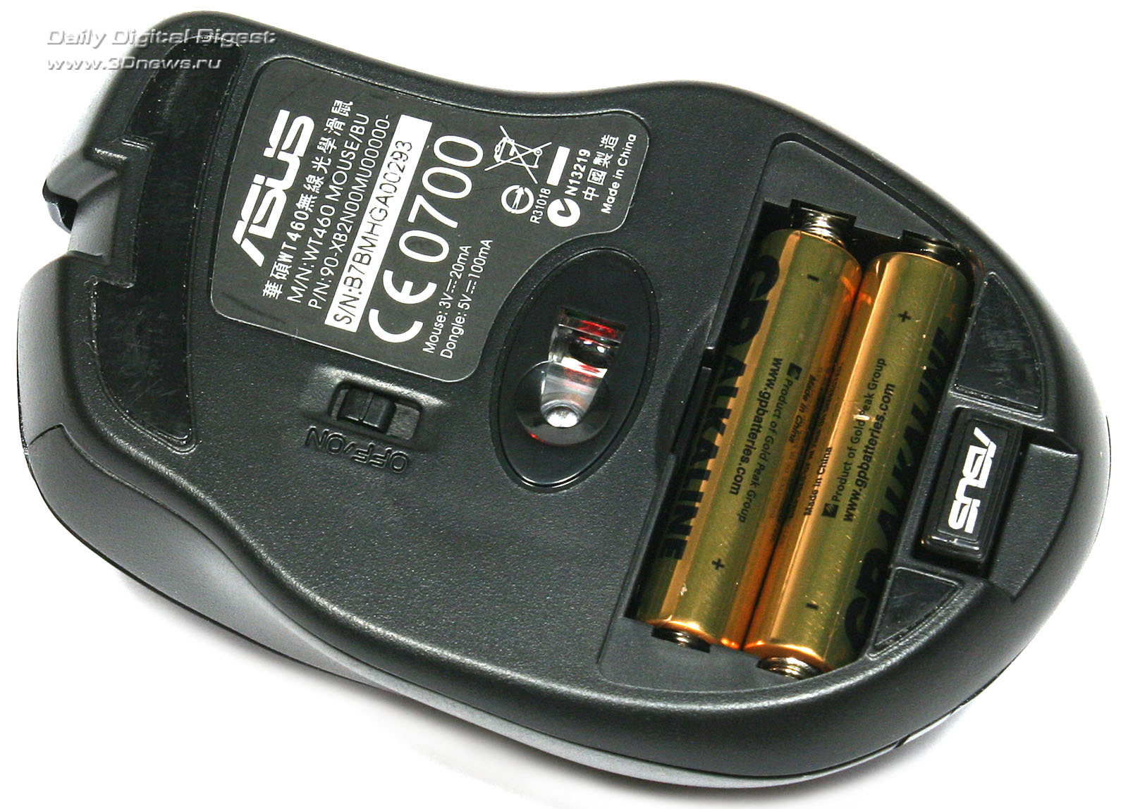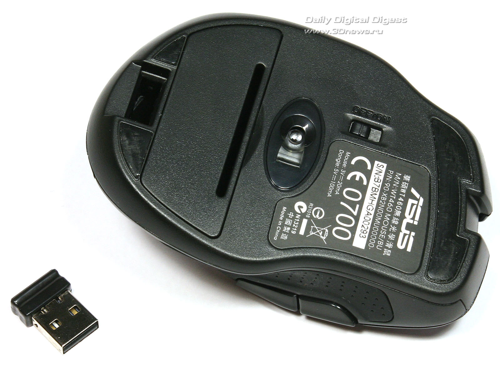 Эффективное скольжение по столу или любой другой ровной поверхности обеспечивается тремя фторопластовыми накладками на «брюшке» новинки. Причём передняя накладка сделана максимально широкой. Кроме оптического сенсора, на нижней стороне корпуса манипулятора ASUS WT460 находится сдвижная кнопка включения/выключения питания и крышка батарейного отсека, расположенного в поперечном направлении. Здесь же можно найти и вертикальный отсек для хранения USB-приёмника. Последний довольно туго вставляется на свое место, так что волноваться о его сохранности при транспортировке мышки не стоит.Нижняя поверхность корпуса и батарейный отсек манипулятора ASUS WT460