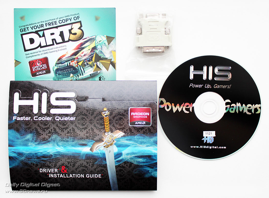 Комплектация минималистическая — здесь только переходник DVI→D-Sub, купон на скачивание DiRT 3 и компакт-диск с драйверами и утилитами.