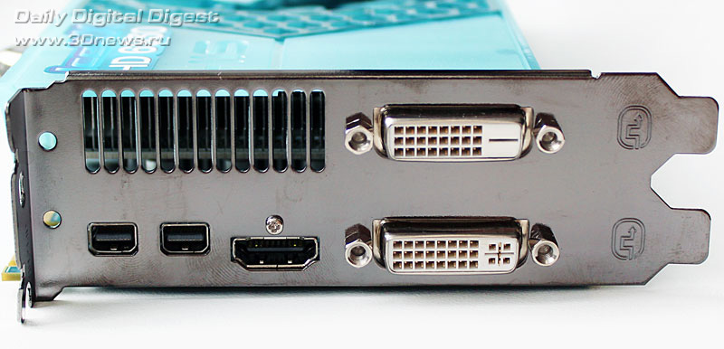 HIS Radeon HD 6930 IceQ X оснащена классическим для видеокарт на графических процессорах Cayman набором выходов: двумя DVI-I (Dual Link + Single Link), одним HDMI версии 1.4а и двумя Mini Display Port версии 1.2: