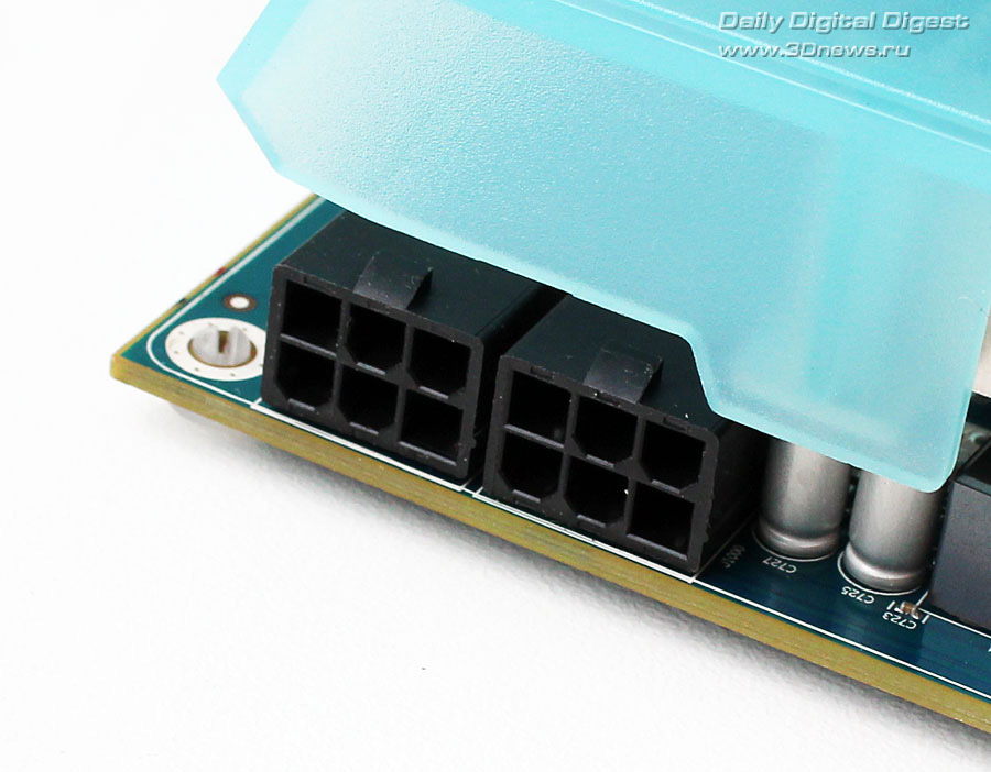 Как видите, на этой панели осталось место и для решётки для частичного выброса нагретого видеокартой воздуха за пределы корпуса системного блока. HIS Radeon HD 6930 IceQ X оснащена двумя шестиконтактными разъёмами для подключения дополнительного питания и двумя разъёмами MIO для создания CrossFireX-конфигураций: