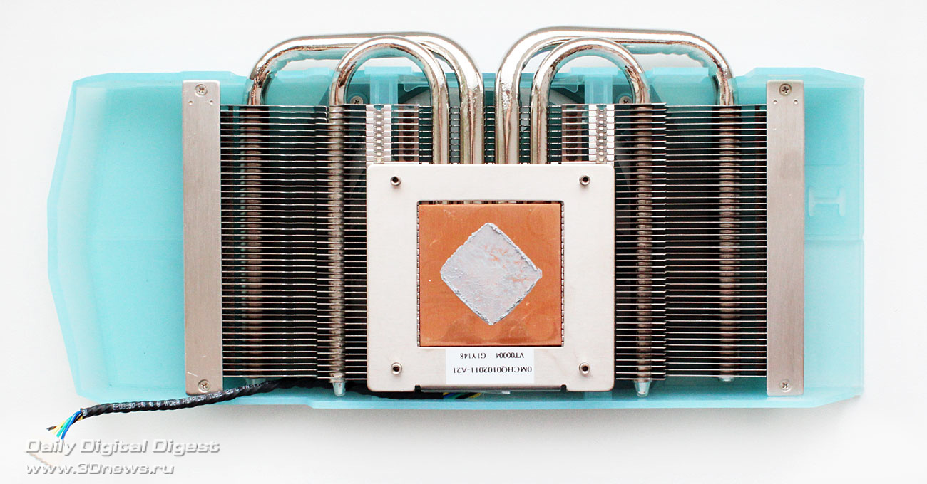 Фирменная система охлаждения HIS IceQ X достаточно проста и состоит из медного основания, выходящих из него никелированных тепловых трубок с нанизанными на них алюминиевыми пластинами и пластикового кожуха с одним вентилятором:Две центральные тепловые трубки в радиаторе имеют диаметр 8 мм, а крайние — 6 мм. Причём центральные трубки распределяют тепловой поток по краям радиатора, а крайние — по его средней части: