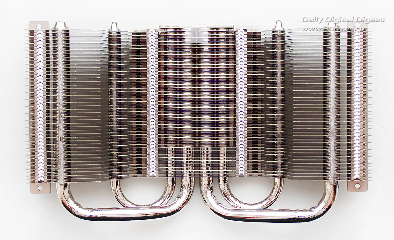 С одной стороны, это хорошо, так как температура на краях пластин радиатора должна быть ниже, ведь трубки ещё и контактируют непосредственно с медным основанием. Но, с другой стороны, в системе охлаждения HIS IceQ X установлен только один вентилятор и размещён он строго по центру радиатора, а значит воздушный поток в первую очередь поступает к центральной части радиатора и только потом распределяется на его края.
