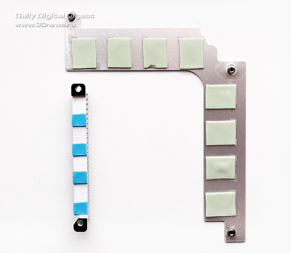 На силовых элементах цепей питания установлен маленький алюминиевый радиатор, а на микросхемах памяти — так и вовсе алюминиевая пластинка с термопрокладками: