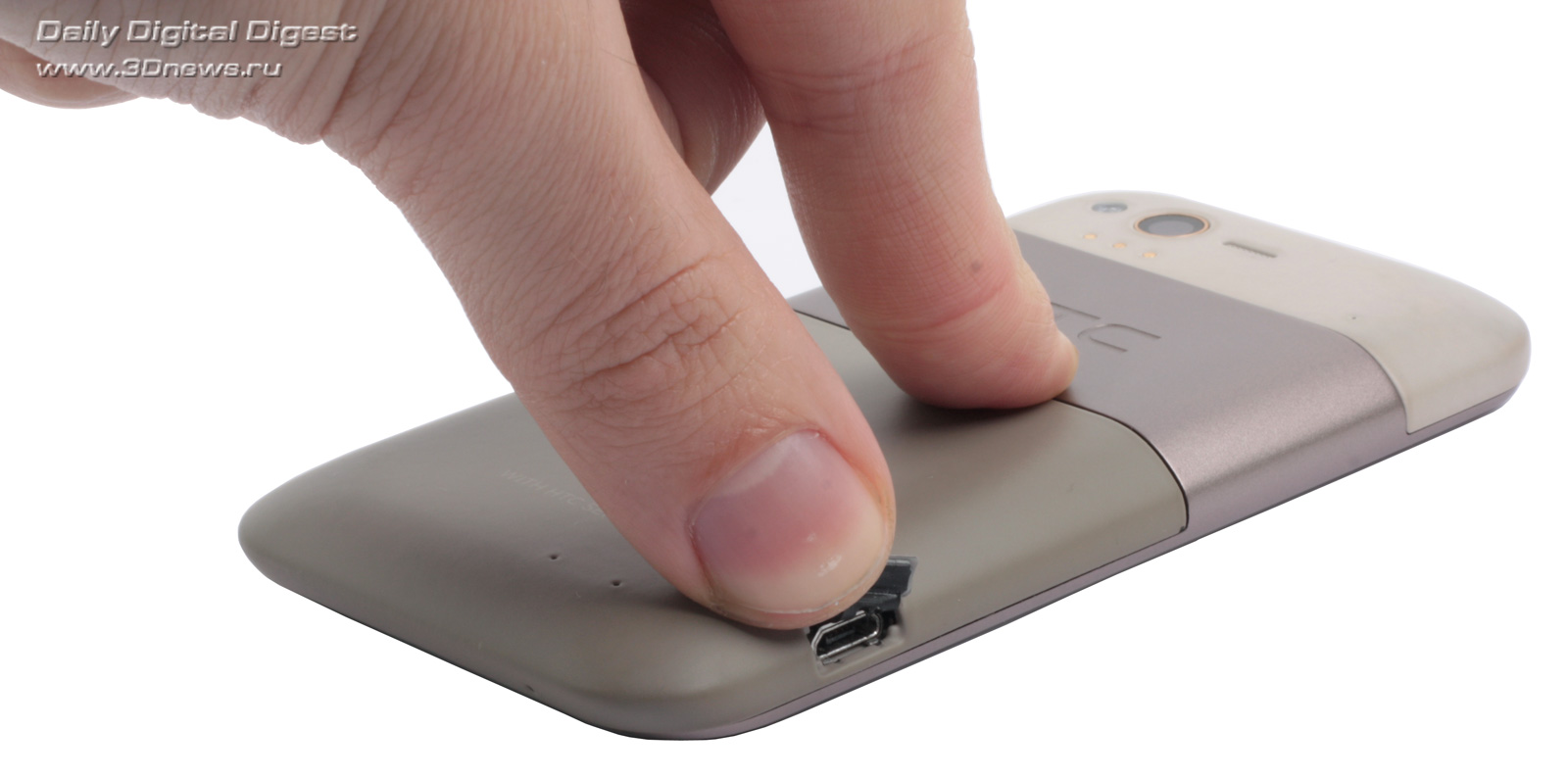 И вдогонку еще две гадости про вставки из soft touch. Та, что притворяется крышкой батареи, недостаточно плотно прилегает к основному корпусу, оставляя весьма заметный зазор в полмиллиметра. Что же до самого пластика, то он приятен на ощупь, но быстро пачкается — и на верхней, более светлой вставке это заметно гораздо сильнее.